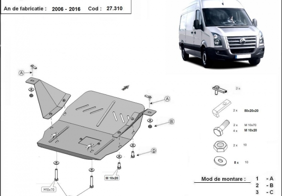 Skid plate for the protection of the: engine, gearbox . The skid plate is new and fits perfectly for all versions of Volkswagen Crafter manufactured between 2006 and 2016. It has an opening for the oil sump, so it's removal won't be necessary to change the oil. Made out of 2 mm thick Steel plate. Screws, nuts, clips, all fastening accessories are included. All skid plates are powder coated to prevent corrosion. The exterior of the skid plate is provided with Steel reinforcements, which increases the resistance to impact. |