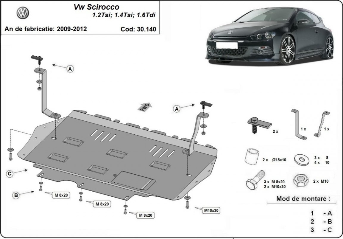 Skid plate for the protection of the: engine, gearbox, radiator . The skid plate is new and fits perfectly for the Volkswagen Scirocco, with the following engine/drive versions: 1.2,2.0TSI, 2.0TDI - manufactured between 2008 and 2017. It has an opening for the oil sump, so it's removal won't be necessary to change the oil. Made out of 2 mm thick Steel plate. Screws, nuts, clips, all fastening accessories are included. All skid plates are powder coated to prevent corrosion. The exterior of the skid plate is provided with Steel reinforcements, which increases the resistance to impact. |