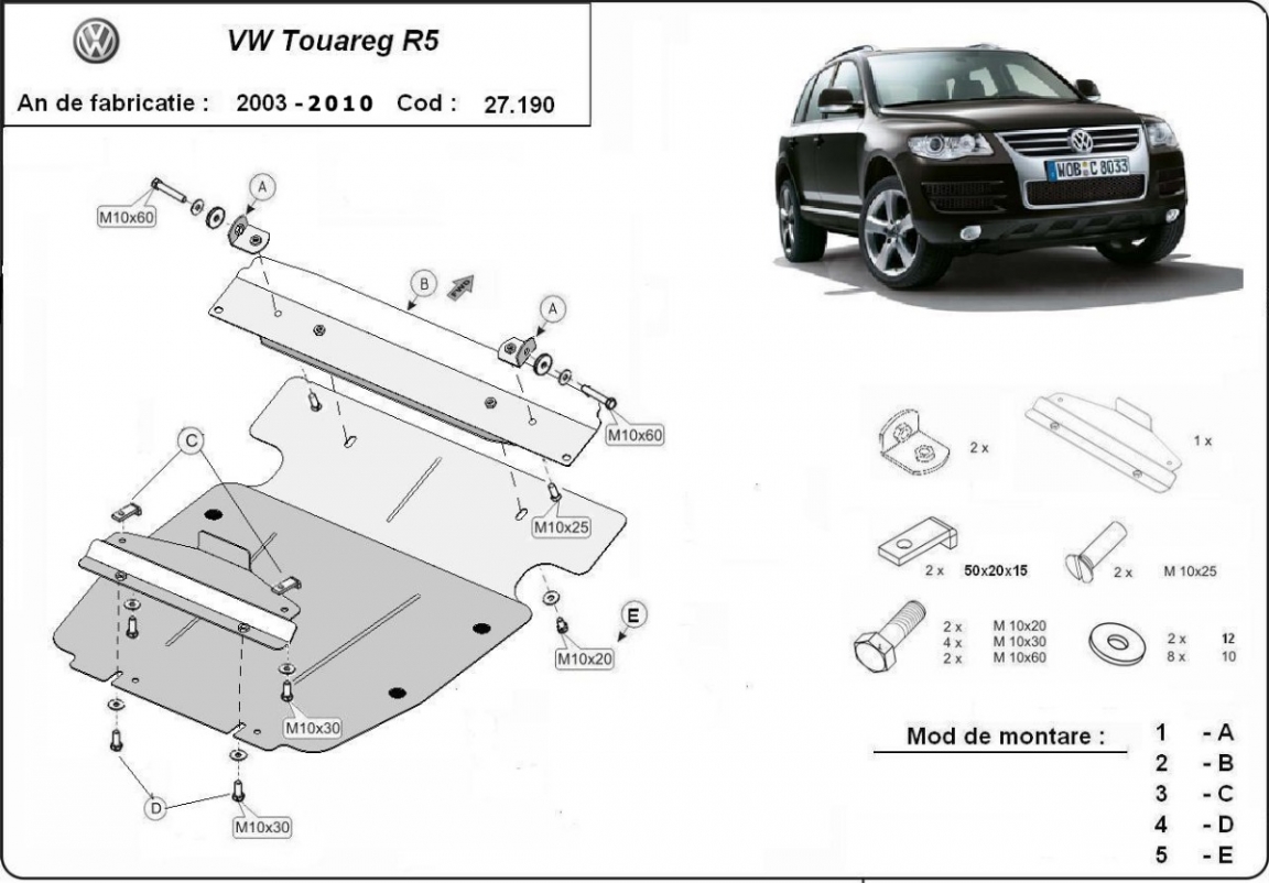Skid plate for the protection of the: engine . The skid plate is new and fits perfectly for all versions of Volkswagen Touareg 7L manufactured between 2003 and 2010. Made out of 3 mm thick Steel plate. Screws, nuts, clips, all fastening accessories are included. All skid plates are powder coated to prevent corrosion. The exterior of the skid plate is provided with Steel reinforcements, which increases the resistance to impact. |