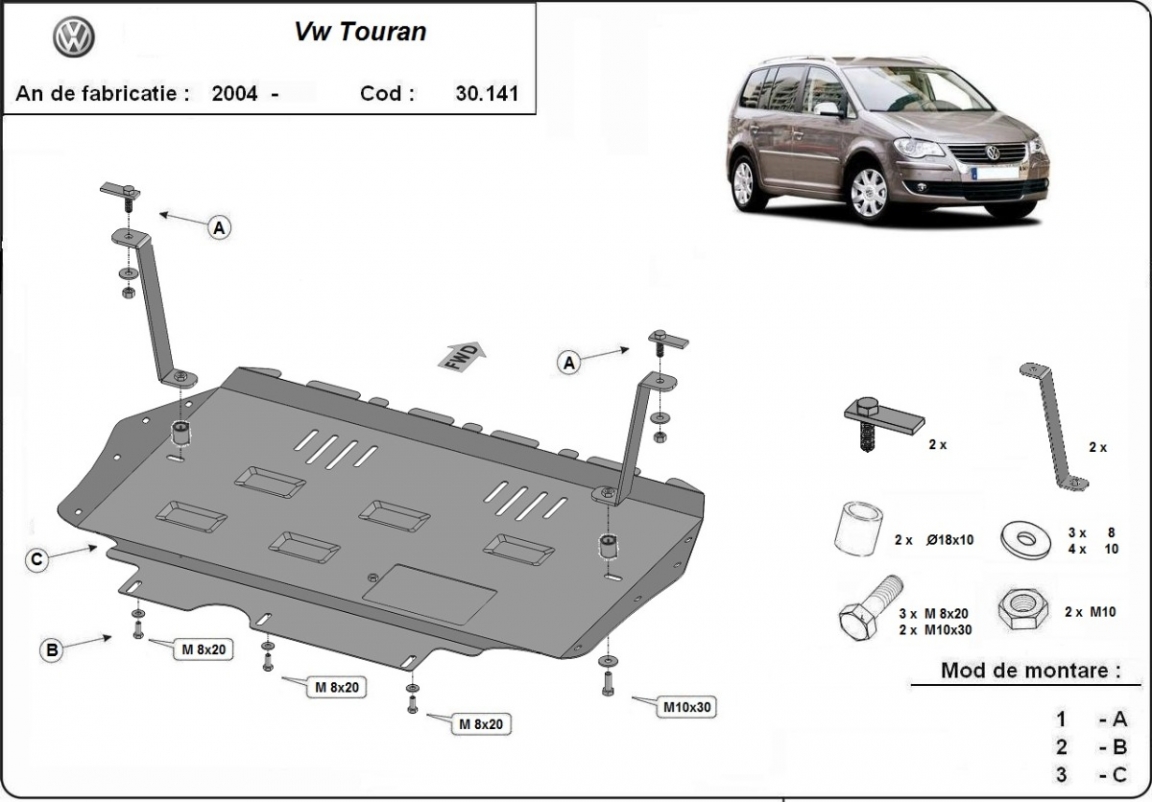 Skid plate for the protection of the: engine, gearbox, radiator . The skid plate is new and fits perfectly for all versions of Volkswagen Touran manufactured between 2003 and 2015. It has an opening for the oil sump, so it's removal won't be necessary to change the oil. Made out of 2 mm thick Steel plate. Screws, nuts, clips, all fastening accessories are included. All skid plates are powder coated to prevent corrosion. The exterior of the skid plate is provided with Steel reinforcements, which increases the resistance to impact. |
