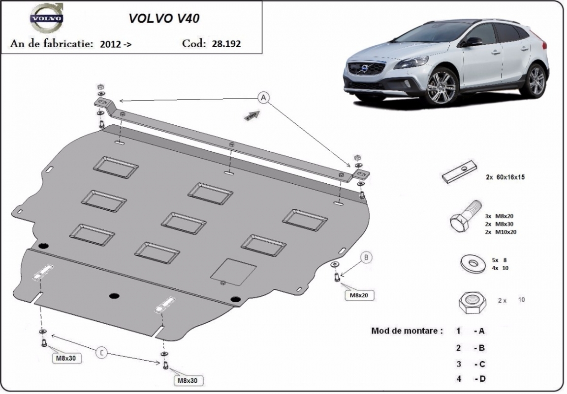 Skid plate for the protection of the: engine, gearbox, radiator . The skid plate is new and fits perfectly for all versions of Volvo V40 manufactured between 2012 and 2019. It has an opening for the oil sump, so it's removal won't be necessary to change the oil. Made out of 2 mm thick Steel plate. Screws, nuts, clips, all fastening accessories are included. All skid plates are powder coated to prevent corrosion. The exterior of the skid plate is provided with Steel reinforcements, which increases the resistance to impact. |