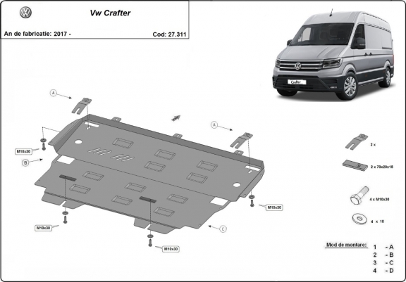 Skid plate for the protection of the: engine, gearbox, radiator . The skid plate is new and fits perfectly for all versions of Vw Crafter manufactured between 2017 and 2026. Made out of 3 mm thick Steel plate. Screws, nuts, clips, all fastening accessories are included. All skid plates are powder coated to prevent corrosion. The exterior of the skid plate is provided with Steel reinforcements, which increases the resistance to impact. |