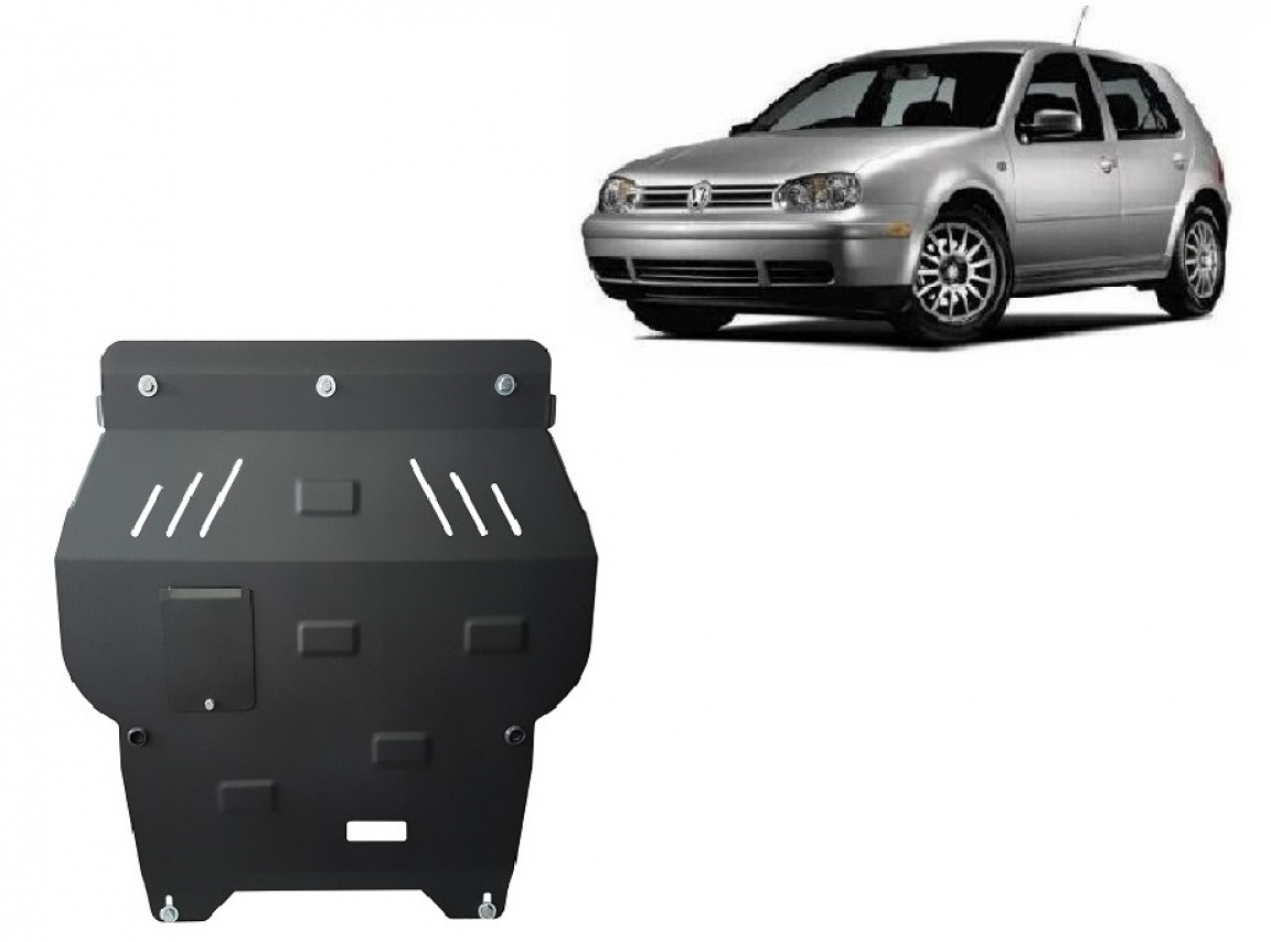 Skid plate for the protection of the: engine, gearbox, radiator, front bumper . The skid plate is new and fits perfectly for the VW Golf mk4, with the following engine/drive versions: 1,4; 1,6; 1,8; 2,3; 1,9D; 2,8 V6 - manufactured between 1998 and 2006. It has an opening for the oil sump, so it's removal won't be necessary to change the oil. Made out of 2 mm thick Steel plate. Screws, nuts, clips, all fastening accessories are included. All skid plates are powder coated to prevent corrosion. The exterior of the skid plate is provided with Steel reinforcements, which increases the resistance to impact. |
