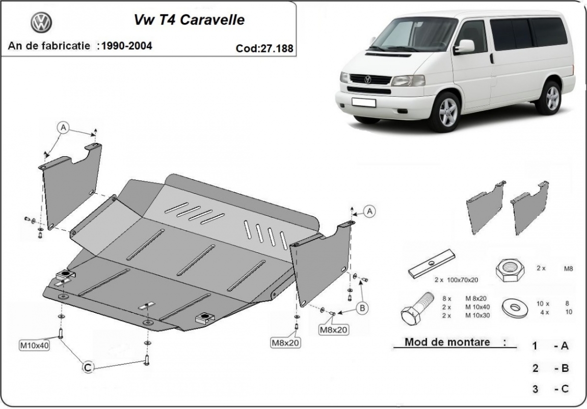 Skid plate for the protection of the: engine, gearbox . The skid plate is new and fits perfectly for all versions of Transporter T4 Caravelle manufactured between 1990 and 2003. Made out of 2 mm thick Steel plate. Screws, nuts, clips, all fastening accessories are included. All skid plates are powder coated to prevent corrosion. The exterior of the skid plate is provided with Steel reinforcements, which increases the resistance to impact. |