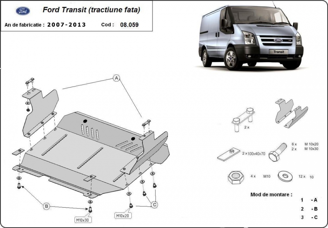 Skid plate for the protection of the: engine, gearbox . The skid plate is new and fits perfectly for all versions of Ford Transit - FWD manufactured between 2007 and 2013. Made out of 2 mm thick Steel plate. Screws, nuts, clips, all fastening accessories are included. All skid plates are powder coated to prevent corrosion. The exterior of the skid plate is provided with Steel reinforcements, which increases the resistance to impact. |