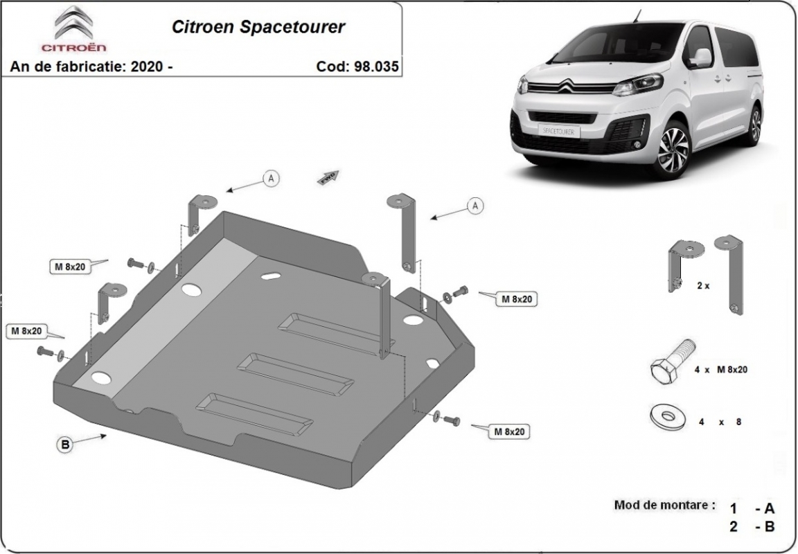 Skid plate for the protection of the: fuel tank AdBlue . The skid plate is new and fits perfectly for all versions of Citroen Spacetourer manufactured between 2020 and 2026. Made out of 2 mm thick Steel plate. Screws, nuts, clips, all fastening accessories are included. All skid plates are powder coated to prevent corrosion. The exterior of the skid plate is provided with Steel reinforcements, which increases the resistance to impact. |