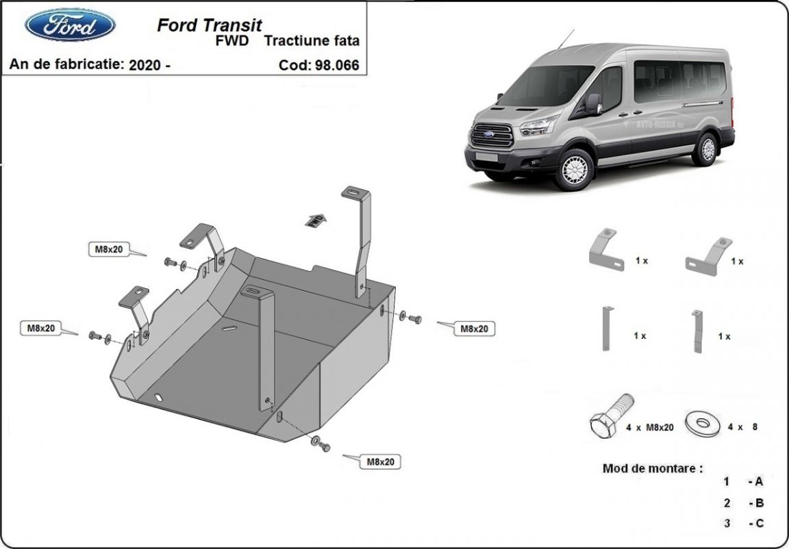 Skid plate for the protection of the: fuel tank AdBlue . The skid plate is new and fits perfectly for all versions of Ford Transit manufactured between 2020 and 2026. Made out of 2 mm thick Steel plate. Screws, nuts, clips, all fastening accessories are included. All skid plates are powder coated to prevent corrosion. The exterior of the skid plate is provided with Steel reinforcements, which increases the resistance to impact. |