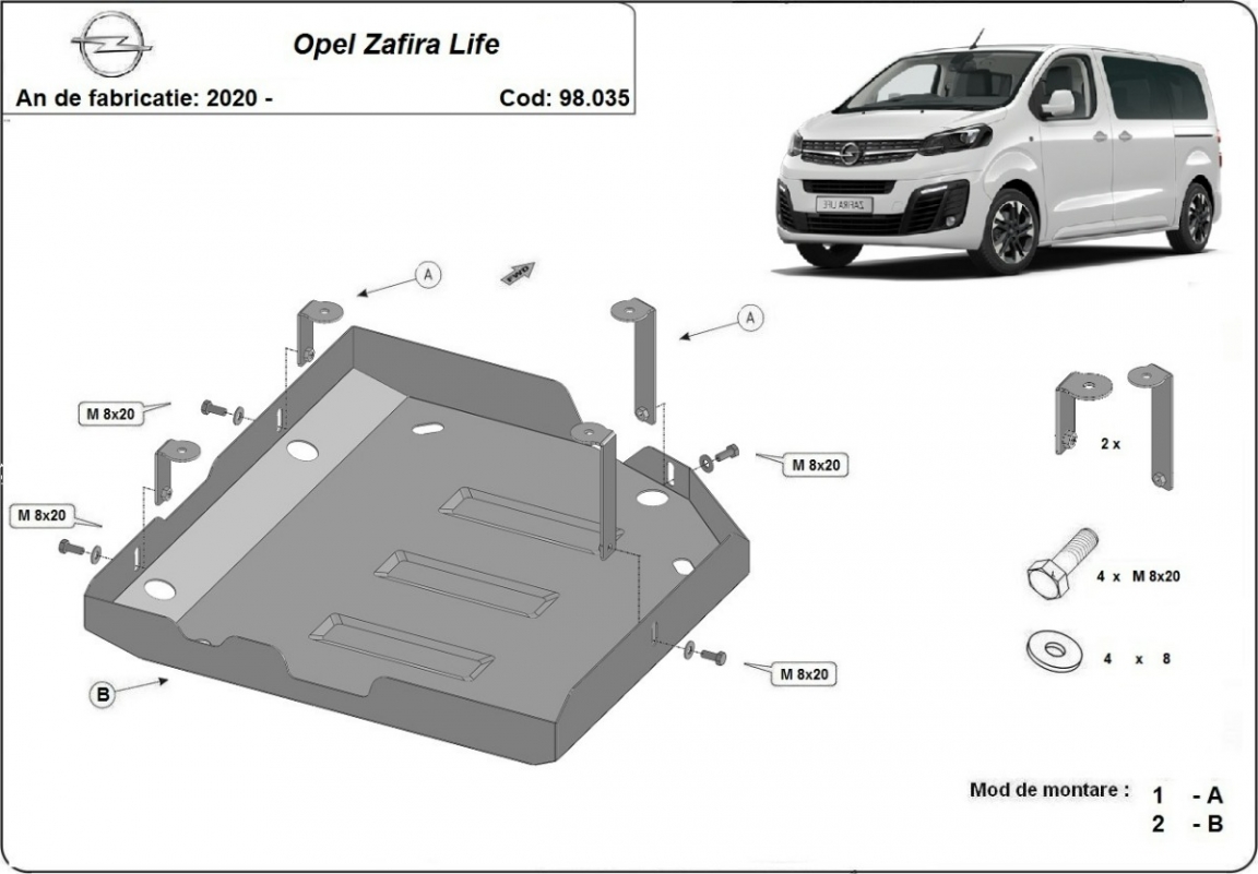 Skid plate for the protection of the: fuel tank AdBlue . The skid plate is new and fits perfectly for all versions of Opel Zafira Life manufactured between 2020 and 2026. Made out of 2 mm thick Steel plate. Screws, nuts, clips, all fastening accessories are included. All skid plates are powder coated to prevent corrosion. The exterior of the skid plate is provided with Steel reinforcements, which increases the resistance to impact. |