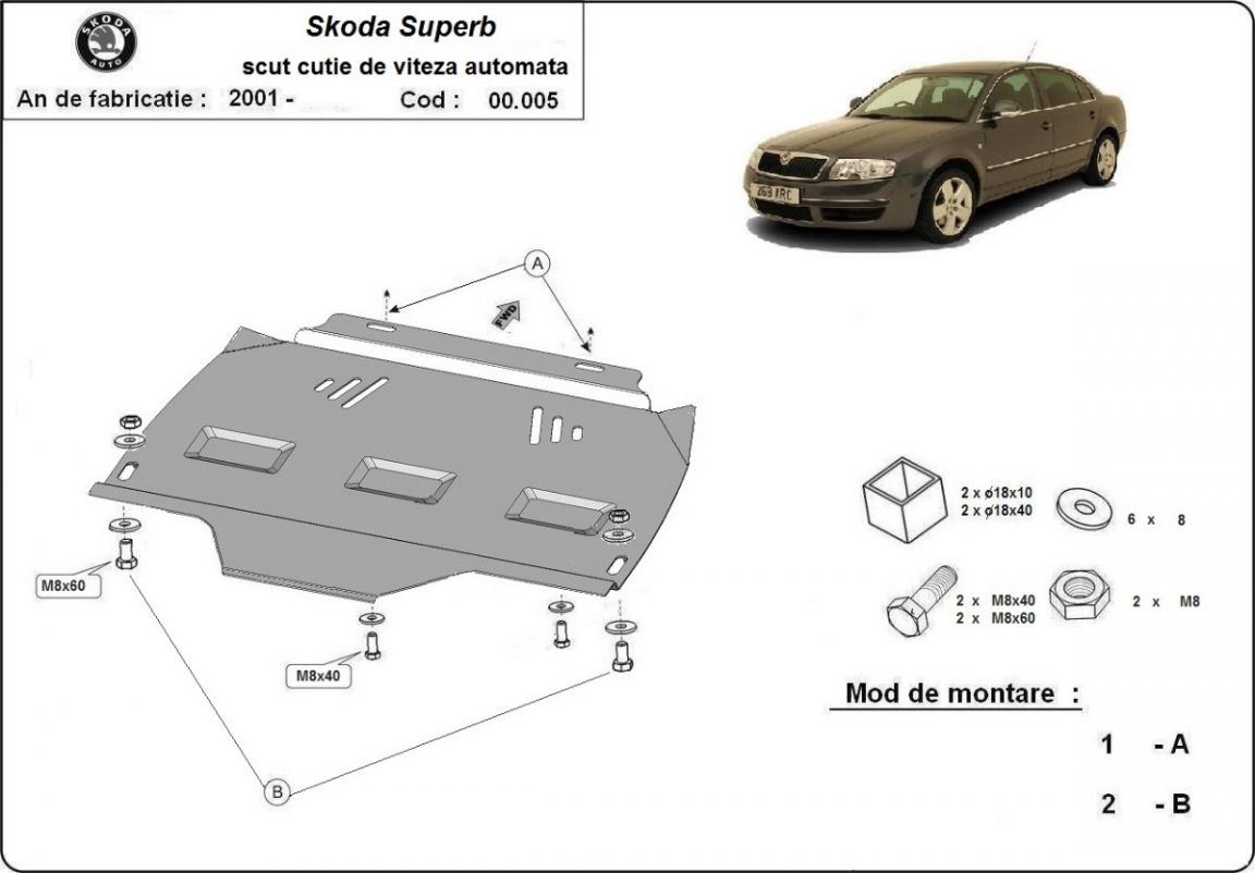 Skid plate for the protection of the: gearbox . The skid plate is new and fits perfectly for all versions of Skoda Superb - automatique manufactured between 2001 and 2008. Made out of 2 mm thick Steel plate. Screws, nuts, clips, all fastening accessories are included. All skid plates are powder coated to prevent corrosion. The exterior of the skid plate is provided with Steel reinforcements, which increases the resistance to impact. |