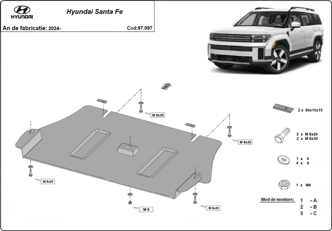 Skid plate for the protection of the: Catalytic converter . The skid plate is new and fits perfectly for all versions of Hyundai Santa Fe manufactured between 2024 and 2026. Made out of 2 mm thick Steel plate. Screws, nuts, clips, all fastening accessories are included. All skid plates are powder coated to prevent corrosion. The exterior of the skid plate is provided with Steel reinforcements, which increases the resistance to impact. |