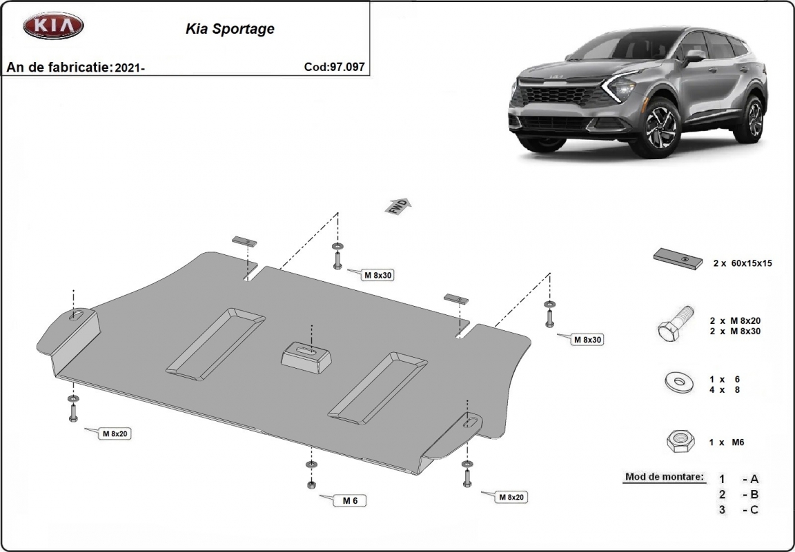 Skid plate for the protection of the: Catalytic converter . The skid plate is new and fits perfectly for all versions of Kia Sportage manufactured between 2021 and 2026. Made out of 2 mm thick Steel plate. Screws, nuts, clips, all fastening accessories are included. All skid plates are powder coated to prevent corrosion. The exterior of the skid plate is provided with Steel reinforcements, which increases the resistance to impact. |
