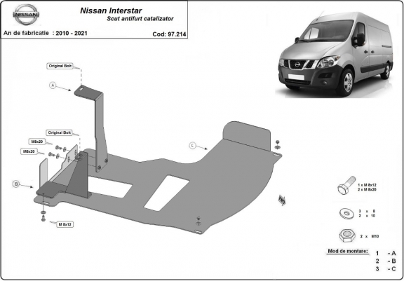 Skid plate for the protection of the: Catalytic converter . The skid plate is new and fits perfectly for all versions of Nissan Interstar manufactured between 2010 and 2021. Made out of 2 mm thick Steel plate. Screws, nuts, clips, all fastening accessories are included. All skid plates are powder coated to prevent corrosion. The exterior of the skid plate is provided with Steel reinforcements, which increases the resistance to impact. |