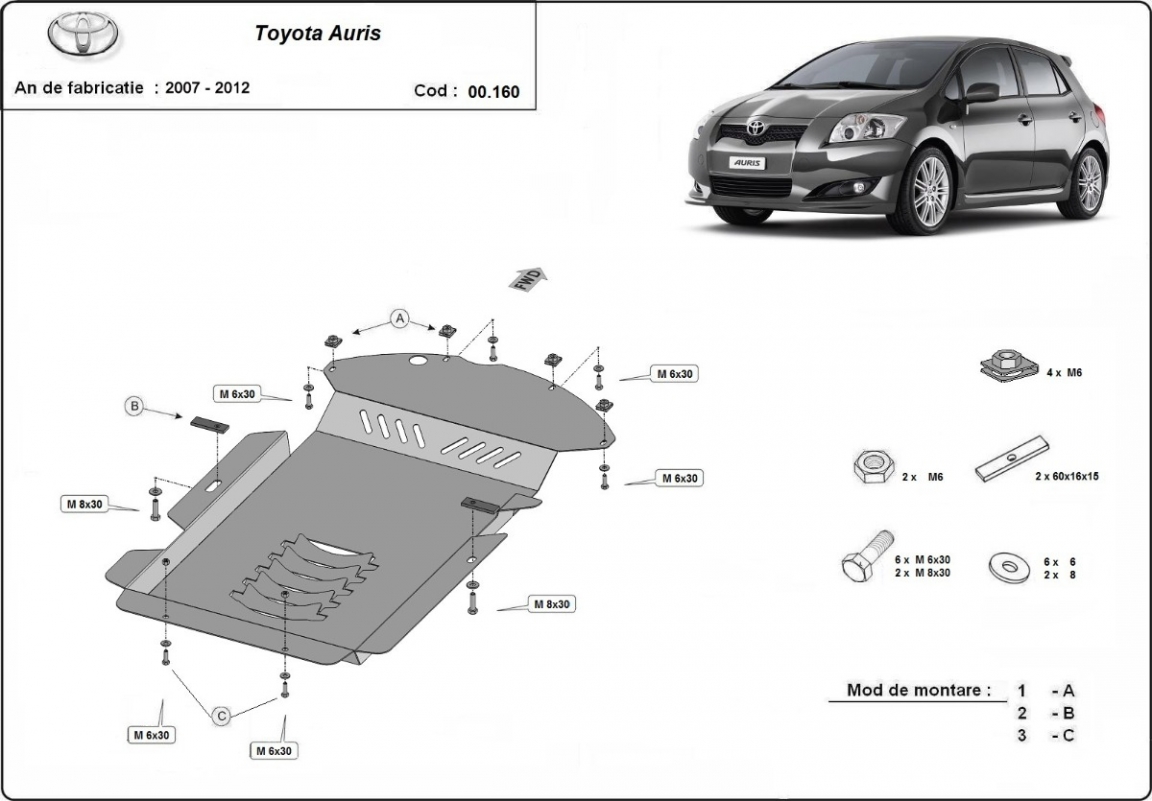 Skid plate for the protection of the: Catalytic converter . The skid plate is new and fits perfectly for all versions of Toyota Auris manufactured between 2007 and 2012. Made out of 2 mm thick Steel plate. Screws, nuts, clips, all fastening accessories are included. All skid plates are powder coated to prevent corrosion. The exterior of the skid plate is provided with Steel reinforcements, which increases the resistance to impact. |