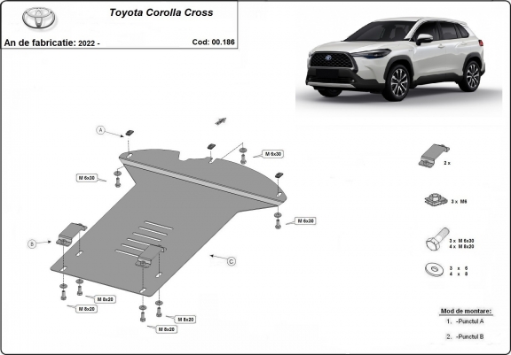 Skid plate for the protection of the: Catalytic converter . The skid plate is new and fits perfectly for all versions of Toyota Corolla Cross manufactured between 2022 and 2026. Made out of 2 mm thick Steel plate. Screws, nuts, clips, all fastening accessories are included. All skid plates are powder coated to prevent corrosion. The exterior of the skid plate is provided with Steel reinforcements, which increases the resistance to impact. |