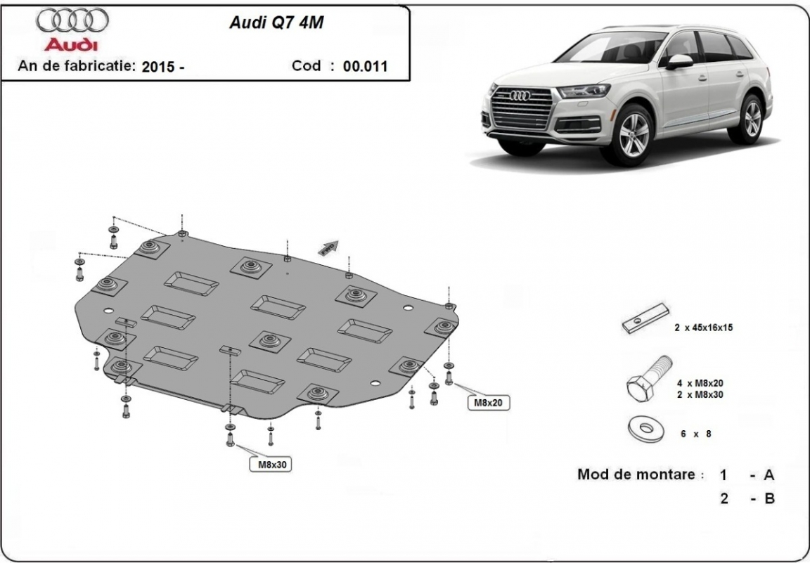 Skid plate for the protection of the: gearbox . The skid plate is new and fits perfectly for all versions of Audi Q7 manufactured between 2015 and 2026. Made out of 2 mm thick Steel plate. Screws, nuts, clips, all fastening accessories are included. All skid plates are powder coated to prevent corrosion. The exterior of the skid plate is provided with Steel reinforcements, which increases the resistance to impact. |