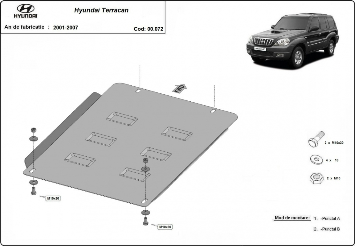 Skid plate for the protection of the: gearbox . The skid plate is new and fits perfectly for all versions of Hyundai Terracan manufactured between 2001 and 2007. Made out of 2.5 mm thick Steel plate. Screws, nuts, clips, all fastening accessories are included. All skid plates are powder coated to prevent corrosion. The exterior of the skid plate is provided with Steel reinforcements, which increases the resistance to impact. |