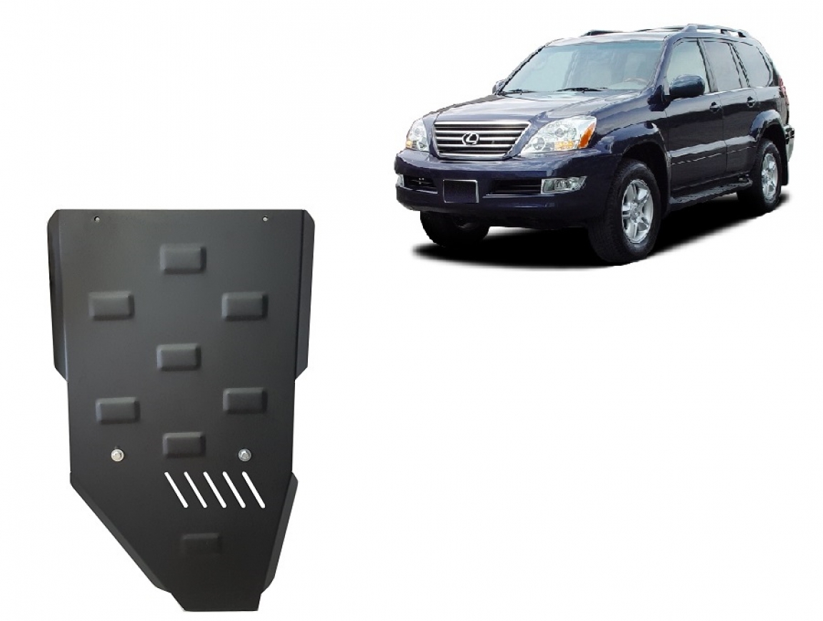 Skid plate for the protection of the: gearbox . The skid plate is new and fits perfectly for all versions of Lexus GX manufactured between 2002 and 2009. Made out of 2.5 mm thick Steel plate. Screws, nuts, clips, all fastening accessories are included. All skid plates are powder coated to prevent corrosion. The exterior of the skid plate is provided with Steel reinforcements, which increases the resistance to impact. |