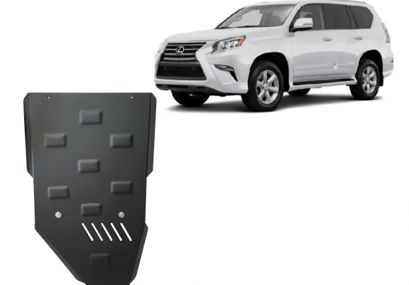 Skid plate for the protection of the: gearbox . The skid plate is new and fits perfectly for all versions of Lexus GX460 manufactured between 2010 and 2026. Made out of 2.5 mm thick Steel plate. Screws, nuts, clips, all fastening accessories are included. All skid plates are powder coated to prevent corrosion. The exterior of the skid plate is provided with Steel reinforcements, which increases the resistance to impact. |