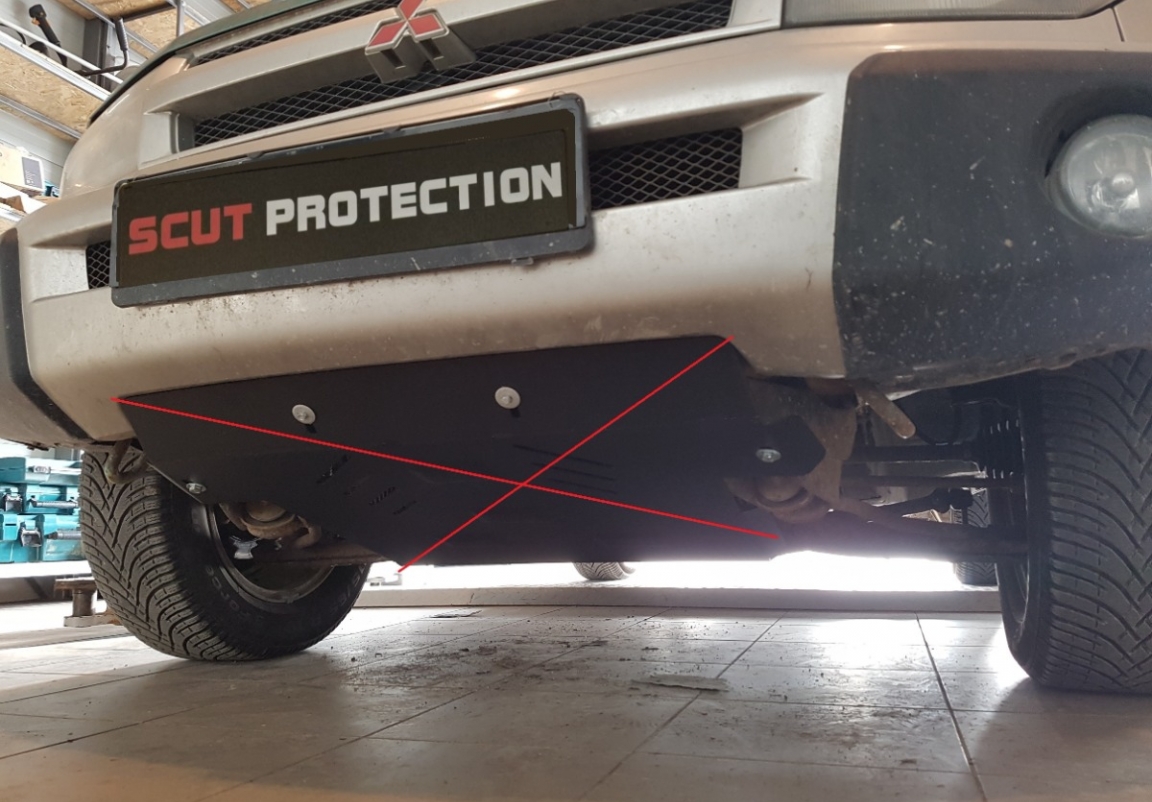Skid plate for the protection of the: gearbox . The skid plate is new and fits perfectly for all versions of Mitsubishi Pajero Pinin manufactured between 1997 and 2007. Made out of 3 mm thick Steel plate. Screws, nuts, clips, all fastening accessories are included. All skid plates are powder coated to prevent corrosion. The exterior of the skid plate is provided with Steel reinforcements, which increases the resistance to impact. |