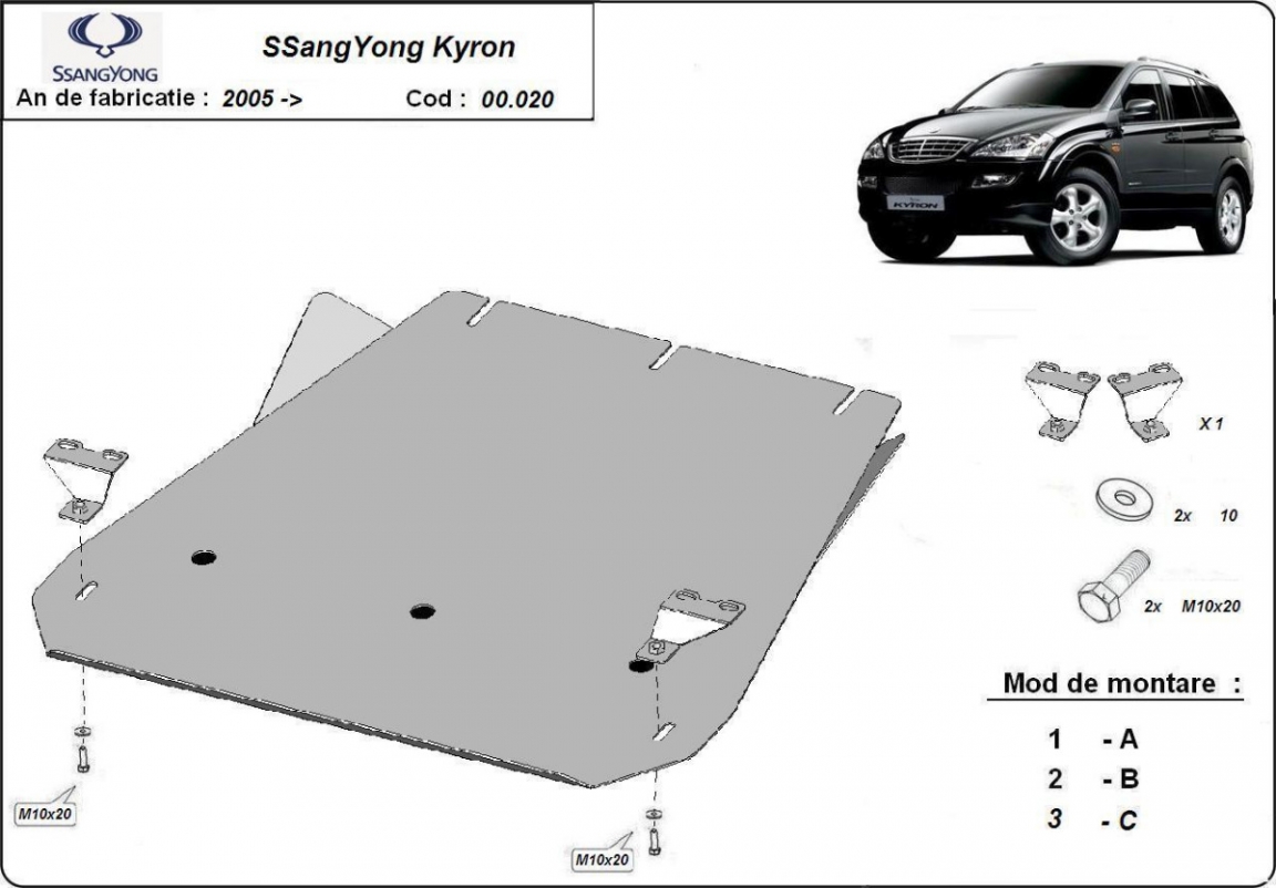 Skid plate for the protection of the: gearbox . The skid plate is new and fits perfectly for the SsangYong Kyron, with the following engine/drive versions: 2.0 Xdi ; 2.7Xdi ; 3.2 ; 2.3 - manufactured between 2005 and 2014. Made out of 2,5 mm thick Steel plate. Screws, nuts, clips, all fastening accessories are included. All skid plates are powder coated to prevent corrosion. The exterior of the skid plate is provided with Steel reinforcements, which increases the resistance to impact. |