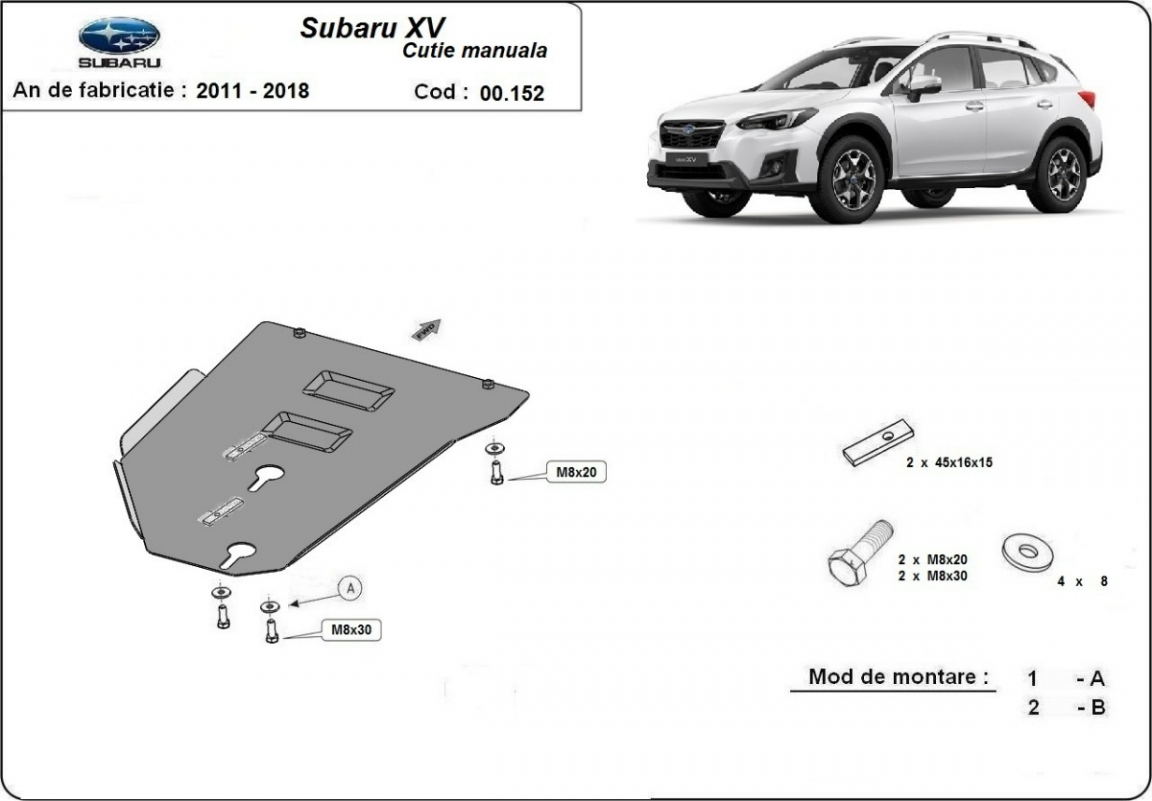 Skid plate for the protection of the: gearbox . The skid plate is new and fits perfectly for all versions of Subaru XV manufactured between 2011 and 2017. Made out of 2 mm thick Steel plate. Screws, nuts, clips, all fastening accessories are included. All skid plates are powder coated to prevent corrosion. The exterior of the skid plate is provided with Steel reinforcements, which increases the resistance to impact. |