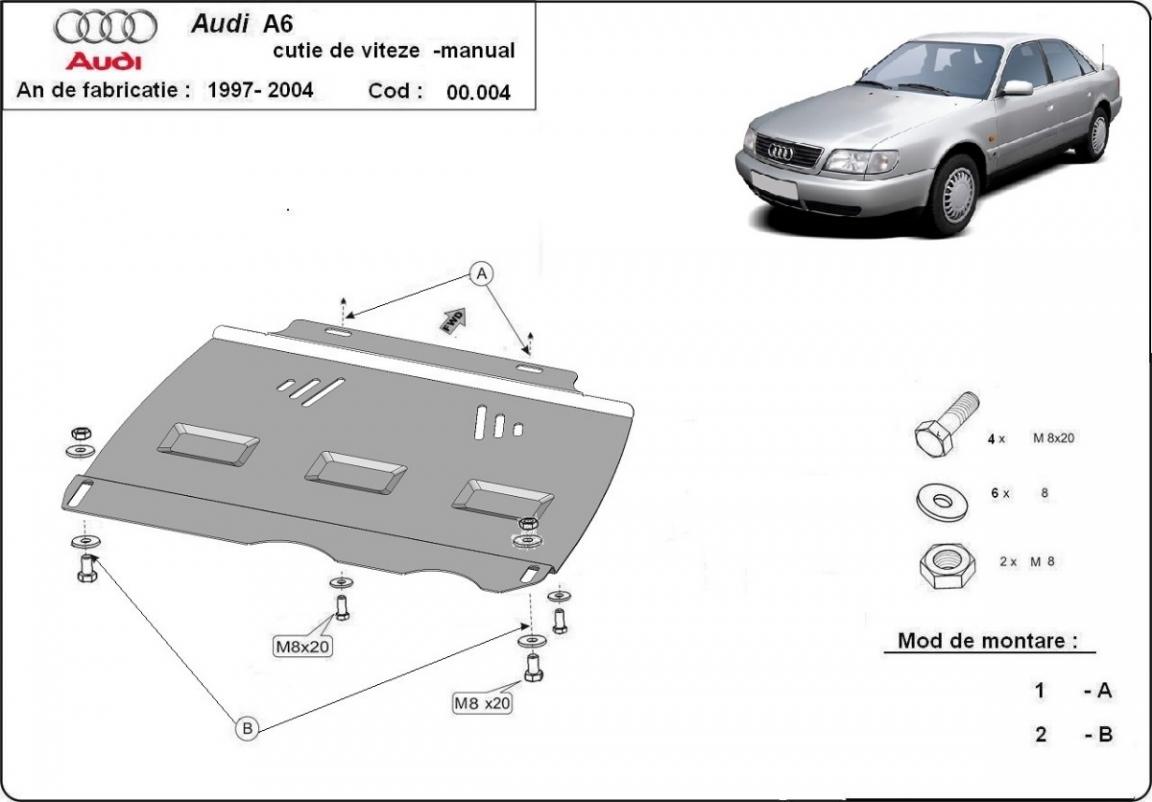 Skid plate for the protection of the: gearbox . The skid plate is new and fits perfectly for the Audi A6 - manuelle, with the following engine/drive versions: manuala - manufactured between 1997 and 2004. Made out of 2 mm thick Steel plate. Screws, nuts, clips, all fastening accessories are included. All skid plates are powder coated to prevent corrosion. The exterior of the skid plate is provided with Steel reinforcements, which increases the resistance to impact. |