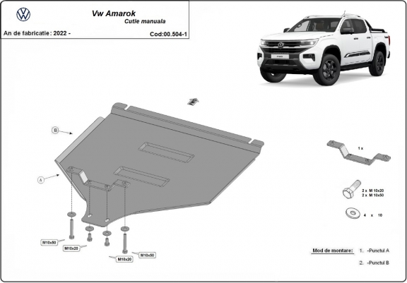 Skid plate for the protection of the: gearbox . The skid plate is new and fits perfectly for all versions of Volkswagen Amarok manufactured between 2022 and 2026. Made out of 3 mm thick Steel plate. Screws, nuts, clips, all fastening accessories are included. All skid plates are powder coated to prevent corrosion. The exterior of the skid plate is provided with Steel reinforcements, which increases the resistance to impact. |