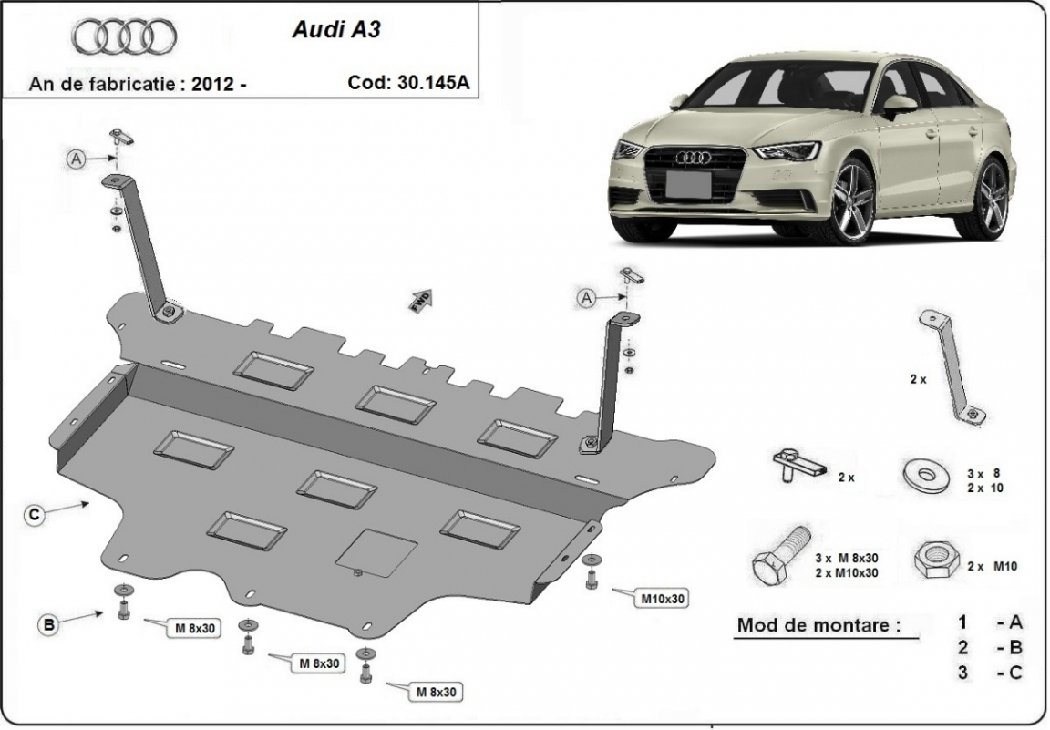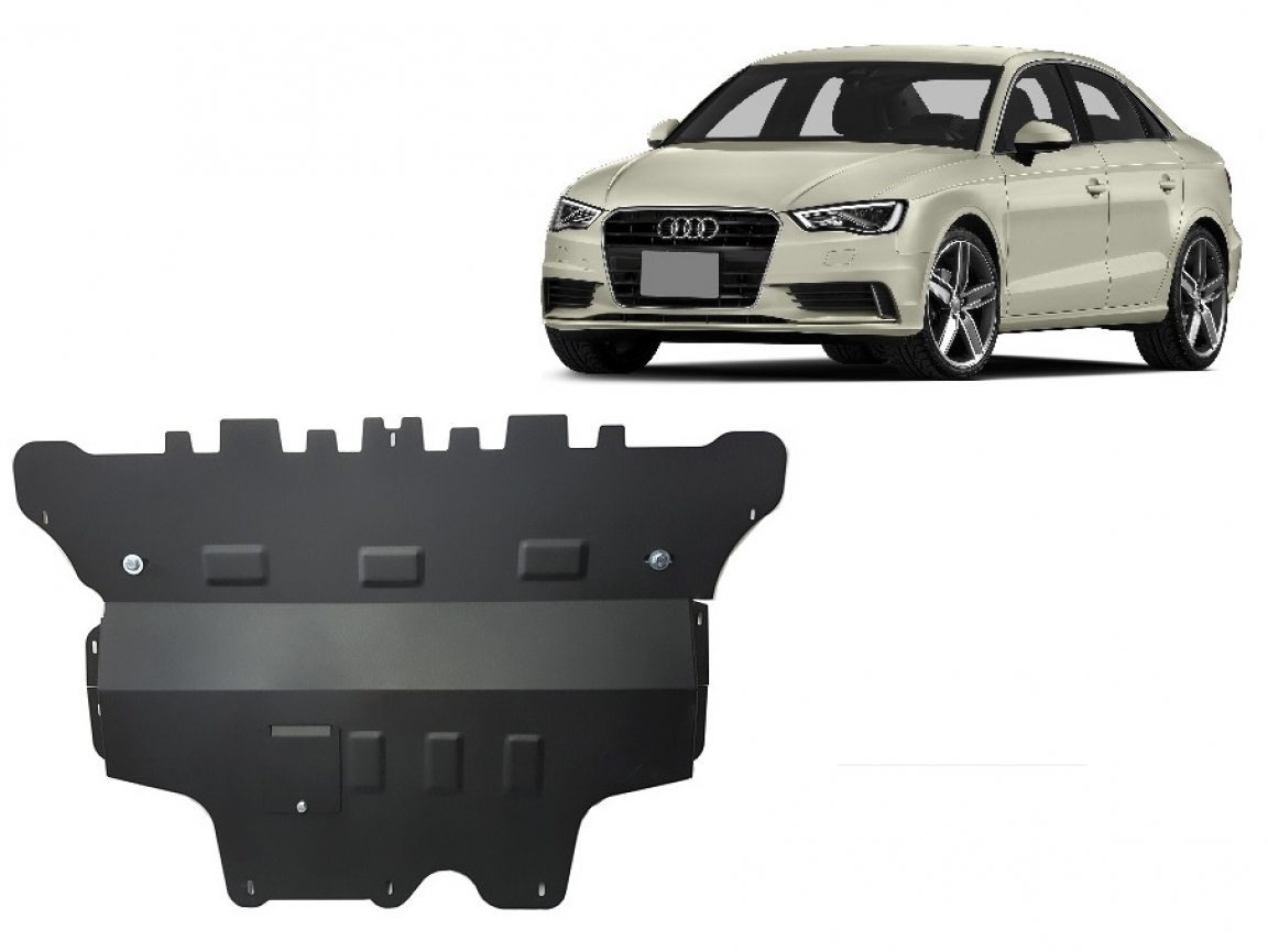 Skid plate for the protection of the: engine, gearbox, radiator, front bumper . The skid plate is new and fits perfectly for all versions of Audi A3 manufactured between 2012 and 2020. Made out of 2 mm thick Steel plate. Screws, nuts, clips, all fastening accessories are included. All skid plates are powder coated to prevent corrosion. The exterior of the skid plate is provided with Steel reinforcements, which increases the resistance to impact. |