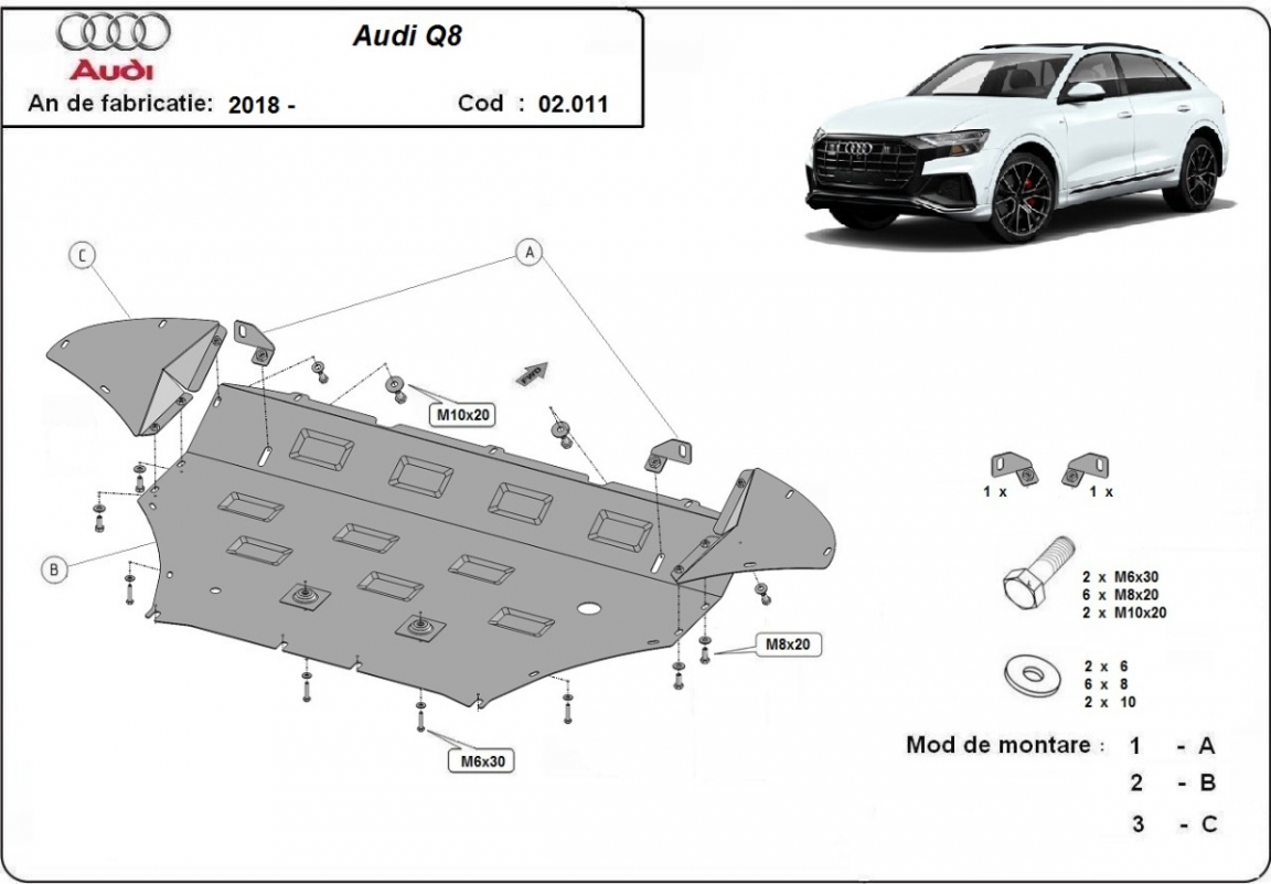 Skid plate for the protection of the: engine, radiator, front bumper . The skid plate is new and fits perfectly for all versions of Audi Q8 manufactured between 2018 and 2020. Made out of 2 mm thick Steel plate. Screws, nuts, clips, all fastening accessories are included. All skid plates are powder coated to prevent corrosion. The exterior of the skid plate is provided with Steel reinforcements, which increases the resistance to impact. |