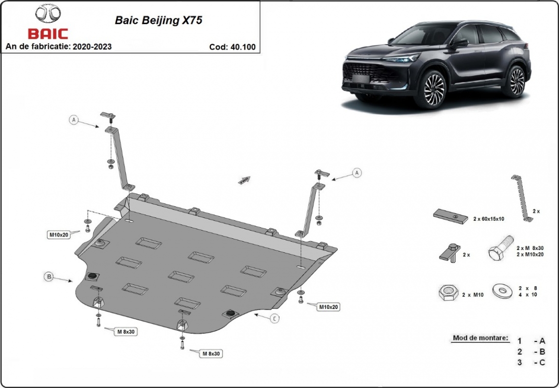Skid plate for the protection of the: engine, gearbox, radiator . The skid plate is new and fits perfectly for all versions of Baic Beijing X75 manufactured between 2020 and 2023. Made out of 2 mm thick Steel plate. Screws, nuts, clips, all fastening accessories are included. All skid plates are powder coated to prevent corrosion. The exterior of the skid plate is provided with Steel reinforcements, which increases the resistance to impact. |