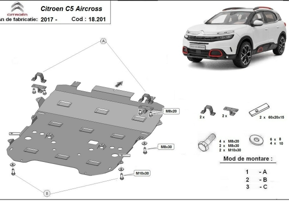 Skid plate for the protection of the: engine, gearbox, radiator, front bumper . The skid plate is new and fits perfectly for all versions of Citroen C5 Aircross manufactured between 2017 and 2026. Made out of 2 mm thick Steel plate. Screws, nuts, clips, all fastening accessories are included. All skid plates are powder coated to prevent corrosion. The exterior of the skid plate is provided with Steel reinforcements, which increases the resistance to impact. |