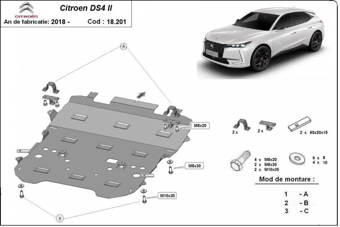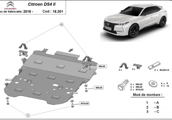 Skid plate for the protection of the: engine, gearbox, radiator, front bumper . The skid plate is new and fits perfectly for all versions of Citroen DS4 manufactured between 2021 and 2026. Made out of 2 mm thick Steel plate. Screws, nuts, clips, all fastening accessories are included. All skid plates are powder coated to prevent corrosion. The exterior of the skid plate is provided with Steel reinforcements, which increases the resistance to impact. |