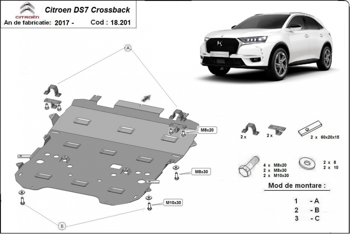 Skid plate for the protection of the: engine, gearbox, radiator, front bumper . The skid plate is new and fits perfectly for all versions of Citroen DS7 Crossback manufactured between 2017 and 2026. Made out of 2 mm thick Steel plate. Screws, nuts, clips, all fastening accessories are included. All skid plates are powder coated to prevent corrosion. The exterior of the skid plate is provided with Steel reinforcements, which increases the resistance to impact. |