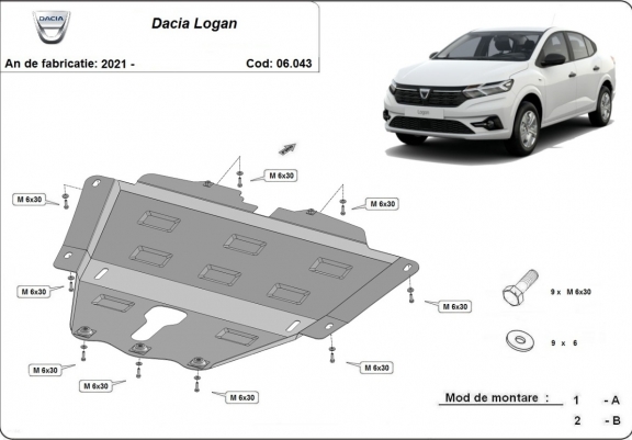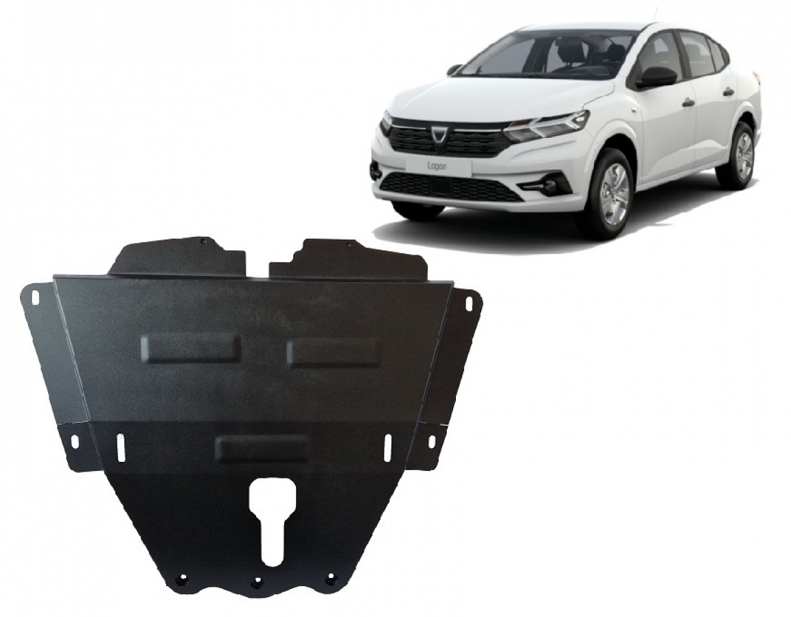 Skid plate for the protection of the: engine, gearbox . The skid plate is new and fits perfectly for all versions of Dacia Logan manufactured between 2021 and 2026. Made out of 2 mm thick Steel plate. Screws, nuts, clips, all fastening accessories are included. All skid plates are powder coated to prevent corrosion. The exterior of the skid plate is provided with Steel reinforcements, which increases the resistance to impact. |