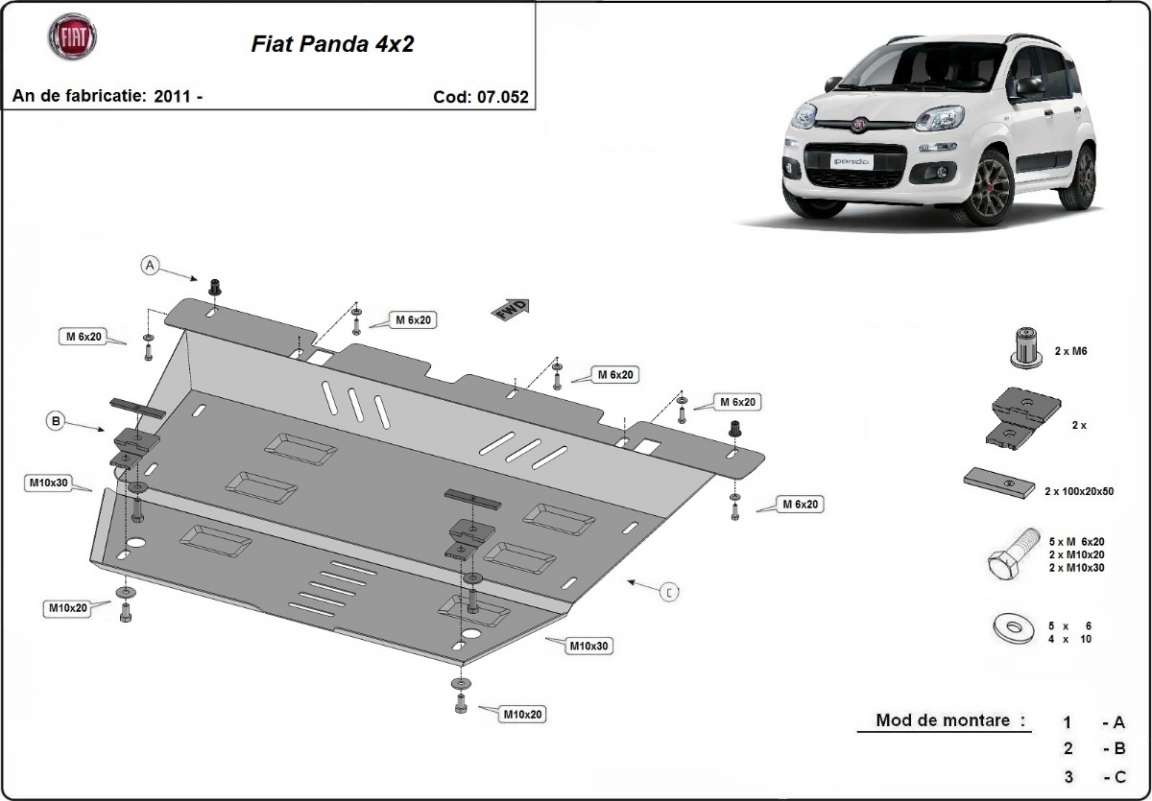 Skid plate for the protection of the: engine, gearbox, radiator, front bumper . The skid plate is new and fits perfectly for all versions of Fiat Panda 4x2 manufactured between 2011 and 2026. Made out of 2 mm thick Steel plate. Screws, nuts, clips, all fastening accessories are included. All skid plates are powder coated to prevent corrosion. The exterior of the skid plate is provided with Steel reinforcements, which increases the resistance to impact. |
