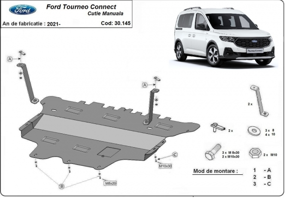 Skid plate for the protection of the: engine, gearbox, radiator, front bumper . The skid plate is new and fits perfectly for all versions of Ford Tourneo Connect manufactured between 2021 and 2026. Made out of 2 mm thick Steel plate. Screws, nuts, clips, all fastening accessories are included. All skid plates are powder coated to prevent corrosion. The exterior of the skid plate is provided with Steel reinforcements, which increases the resistance to impact. |