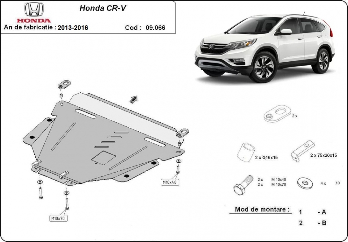 Skid plate for the protection of the: engine, gearbox, radiator . The skid plate is new and fits perfectly for all versions of Honda CR-V manufactured between 2013 and 2016. It has an opening for the oil sump, so it's removal won't be necessary to change the oil. Made out of 2,5 mm thick Steel plate. Screws, nuts, clips, all fastening accessories are included. All skid plates are powder coated to prevent corrosion. The exterior of the skid plate is provided with Steel reinforcements, which increases the resistance to impact. |