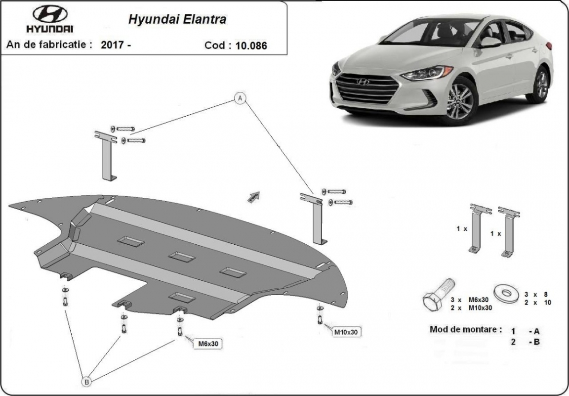 Skid plate for the protection of the: engine, gearbox, radiator, front bumper . The skid plate is new and fits perfectly for all versions of Hyundai Elantra manufactured between 2016 and 2020. Made out of 2 mm thick Steel plate. Screws, nuts, clips, all fastening accessories are included. All skid plates are powder coated to prevent corrosion. The exterior of the skid plate is provided with Steel reinforcements, which increases the resistance to impact. |