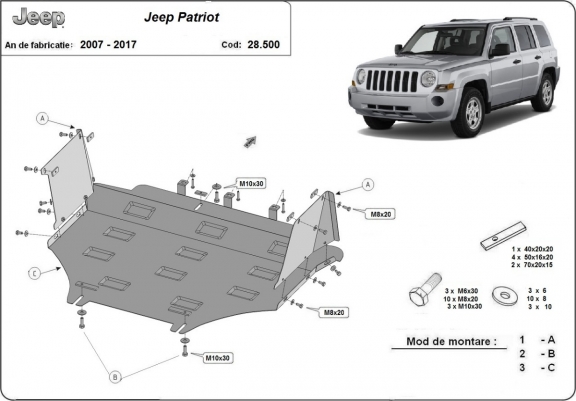 Skid plate for the protection of the: engine, radiator, front bumper . The skid plate is new and fits perfectly for all versions of Jeep Patriot manufactured between 2007 and 2017. Made out of 2 mm thick Steel plate. Screws, nuts, clips, all fastening accessories are included. All skid plates are powder coated to prevent corrosion. The exterior of the skid plate is provided with Steel reinforcements, which increases the resistance to impact. |