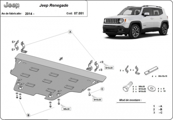 Skid plate for the protection of the: engine, gearbox, radiator, front bumper . The skid plate is new and fits perfectly for all versions of Jeep Renegade manufactured between 2014 and 2026. Made out of 2 mm thick Steel plate. Screws, nuts, clips, all fastening accessories are included. All skid plates are powder coated to prevent corrosion. The exterior of the skid plate is provided with Steel reinforcements, which increases the resistance to impact. |