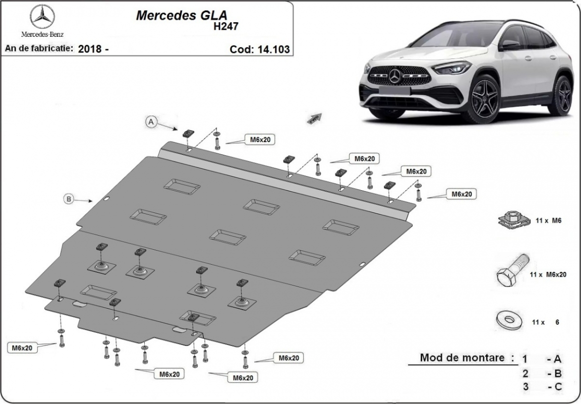 Skid plate for the protection of the: engine, gearbox, radiator . The skid plate is new and fits perfectly for all versions of Mercedes GLA H247 manufactured between 2019 and 2026. Made out of 2 mm thick Steel plate. Screws, nuts, clips, all fastening accessories are included. All skid plates are powder coated to prevent corrosion. The exterior of the skid plate is provided with Steel reinforcements, which increases the resistance to impact. |