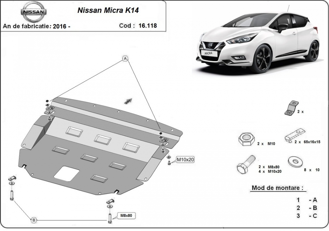 Skid plate for the protection of the: engine, gearbox, radiator . The skid plate is new and fits perfectly for all versions of Nissan Micra manufactured between 2016 and 2026. Made out of 2 mm thick Steel plate. Screws, nuts, clips, all fastening accessories are included. All skid plates are powder coated to prevent corrosion. The exterior of the skid plate is provided with Steel reinforcements, which increases the resistance to impact. |