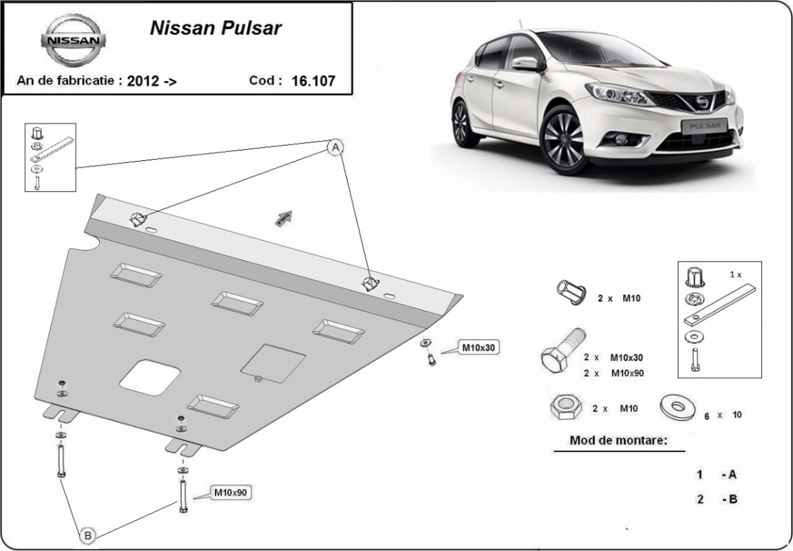 Skid plate for the protection of the: engine, gearbox . The skid plate is new and fits perfectly for all versions of Nissan Pulsar manufactured between 2012 and 2018. It has an opening for the oil sump, so it's removal won't be necessary to change the oil. Made out of 2 mm thick Steel plate. Screws, nuts, clips, all fastening accessories are included. All skid plates are powder coated to prevent corrosion. The exterior of the skid plate is provided with Steel reinforcements, which increases the resistance to impact. |