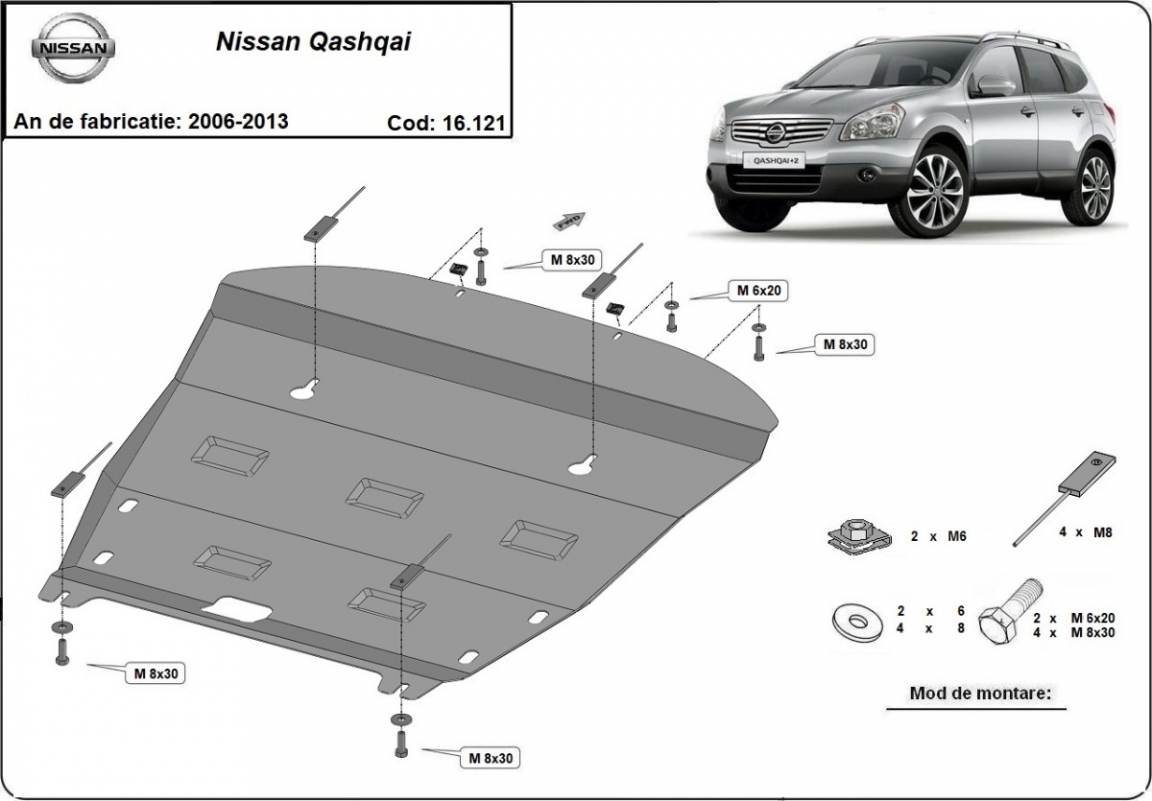 Skid plate for the protection of the: engine, gearbox, radiator, front bumper . The skid plate is new and fits perfectly for all versions of Nissan Qashqai manufactured between 2006 and 2013. Made out of 2 mm thick Steel plate. Screws, nuts, clips, all fastening accessories are included. All skid plates are powder coated to prevent corrosion. The exterior of the skid plate is provided with Steel reinforcements, which increases the resistance to impact. |