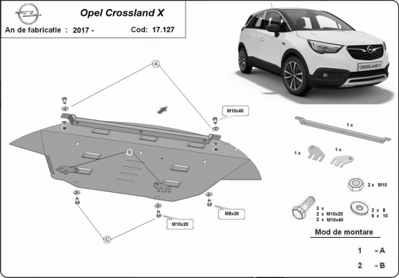 Skid plate for the protection of the: engine, gearbox, radiator, front bumper . The skid plate is new and fits perfectly for all versions of Opel Crossland X manufactured between 2017 and 2026. Made out of 2 mm thick Steel plate. Screws, nuts, clips, all fastening accessories are included. All skid plates are powder coated to prevent corrosion. The exterior of the skid plate is provided with Steel reinforcements, which increases the resistance to impact. |