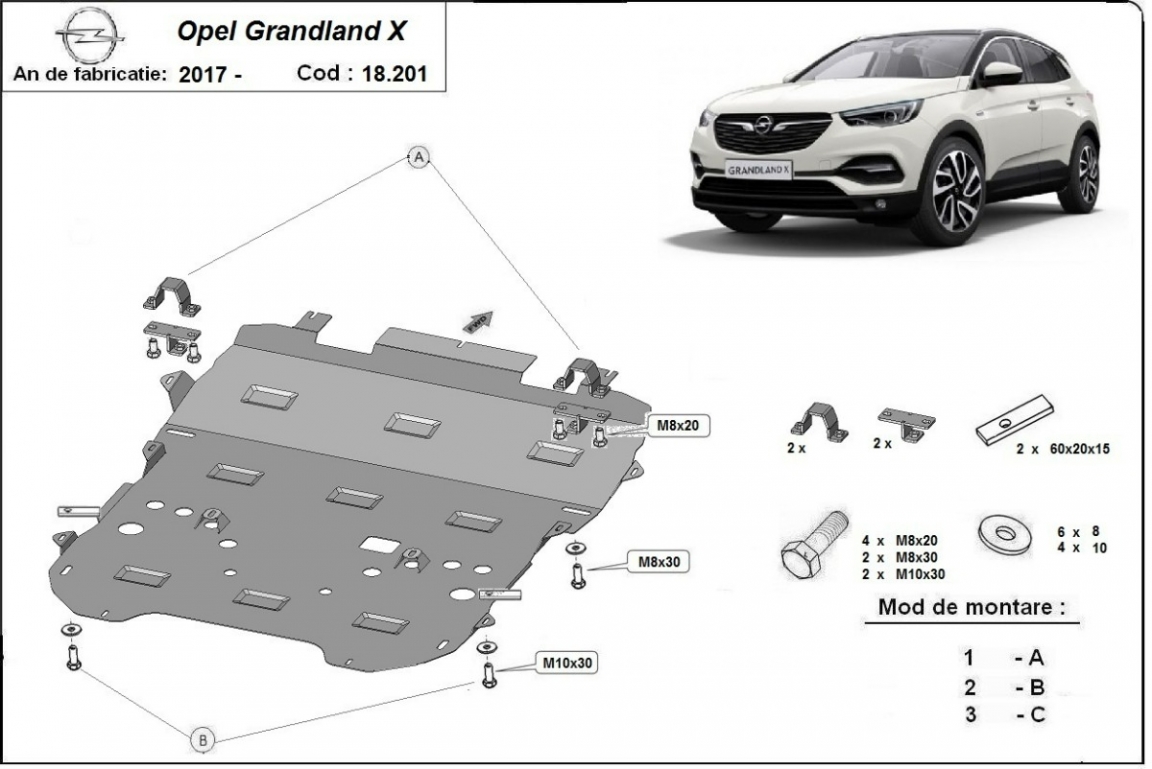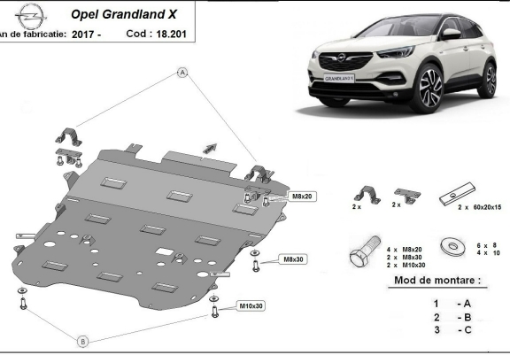 Skid plate for the protection of the: engine, gearbox, radiator, front bumper . The skid plate is new and fits perfectly for all versions of Opel Grandland X manufactured between 2017 and 2026. Made out of 2 mm thick Steel plate. Screws, nuts, clips, all fastening accessories are included. All skid plates are powder coated to prevent corrosion. The exterior of the skid plate is provided with Steel reinforcements, which increases the resistance to impact. |