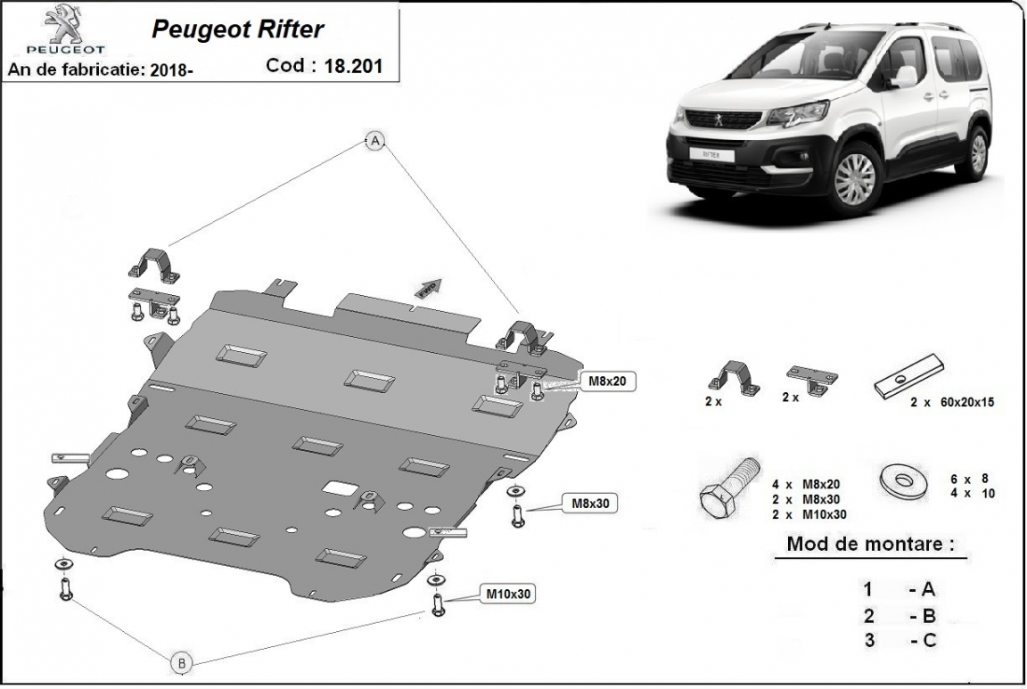 Skid plate for the protection of the: engine, gearbox, radiator, front bumper . The skid plate is new and fits perfectly for all versions of Peugeot Rifter manufactured between 2018 and 2026. Made out of 2 mm thick Steel plate. Screws, nuts, clips, all fastening accessories are included. All skid plates are powder coated to prevent corrosion. The exterior of the skid plate is provided with Steel reinforcements, which increases the resistance to impact. |