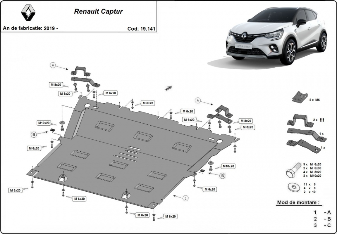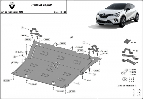 Skid plate for the protection of the: engine, gearbox, radiator . The skid plate is new and fits perfectly for all versions of Renault Captur manufactured between 2019 and 2026. Made out of 2 mm thick Steel plate. Screws, nuts, clips, all fastening accessories are included. All skid plates are powder coated to prevent corrosion. The exterior of the skid plate is provided with Steel reinforcements, which increases the resistance to impact. |