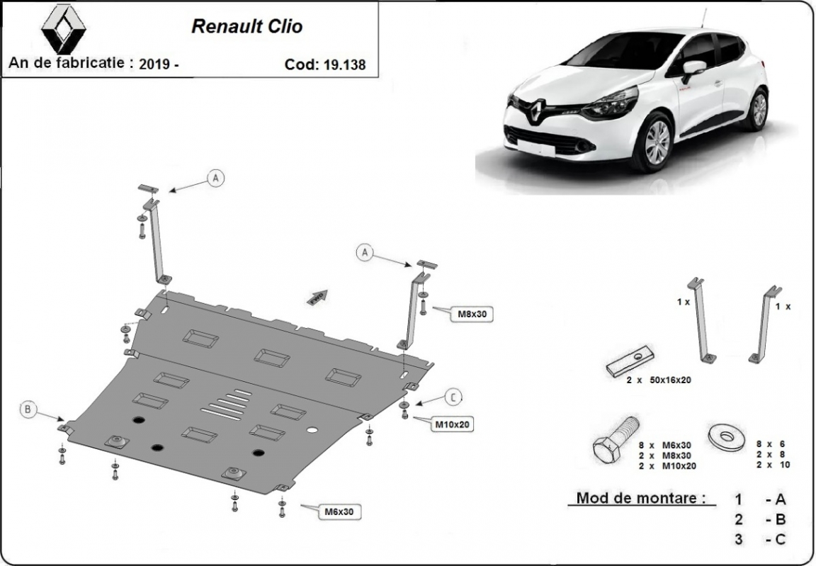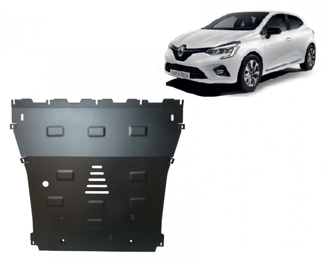 Skid plate for the protection of the: engine, gearbox, radiator . The skid plate is new and fits perfectly for all versions of Renault Clio 5 manufactured between 2019 and 2026. Made out of 2 mm thick Steel plate. Screws, nuts, clips, all fastening accessories are included. All skid plates are powder coated to prevent corrosion. The exterior of the skid plate is provided with Steel reinforcements, which increases the resistance to impact. |