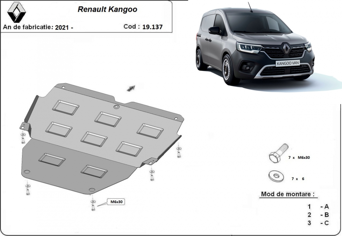 Skid plate for the protection of the: engine, gearbox . The skid plate is new and fits perfectly for all versions of Renault Kangoo manufactured between 2021 and 2026. Made out of 2 mm thick Steel plate. Screws, nuts, clips, all fastening accessories are included. All skid plates are powder coated to prevent corrosion. The exterior of the skid plate is provided with Steel reinforcements, which increases the resistance to impact. |